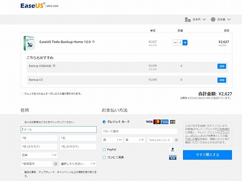 ご購入 システムクローンが出来るソフトを購入。 ここまでで、SSD(5,200)+USB Box(1,999円)+クローニングソフト(2,627円)→合計 9,826円のお支払い。 SSDは安いけど、周辺が高く付くね。(^_^;) |