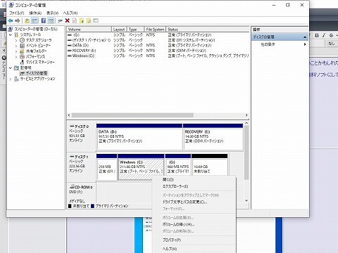 ディスクの管理では パーティションを拡張するために、Win10標準のコンピュータ管理 → ディスク管理画面へ。 Cドライブを選んで右クリックをしてプルダウンメニューから・・・・・。 ”ボリュームの拡張”がアクティブになりません??? 「え〜っ。」 Win10の標準のディスク管理だと、ボリュームの拡張が出来ないの? ネットで探してみたけど、システムの入っているドライブはボリュームの拡張が出来ないらしい。 Win7 の時は出来た様な気がしましたが、記憶違いだったのか。 |