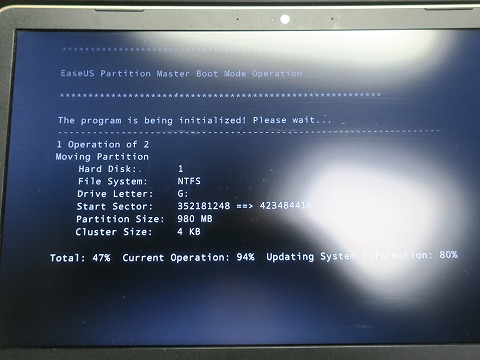 16:49 移動中 再起動をすると、パーティションを移動している(だろう)画面が標示されます。 上手く行ってるみたい。 |