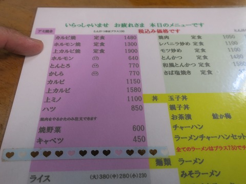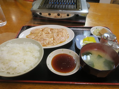 18:23 ホルモン焼定食 5分ほど待ってホルモン焼定食が運ばれてきました。 モルモンは脂少なめ、と言うよりほとんど脂分は取ってあります。 量は結構ありますね。 普通の2人前くらい? ドンブリのご飯は大盛ですね。 それでは、いただきましょう。 |