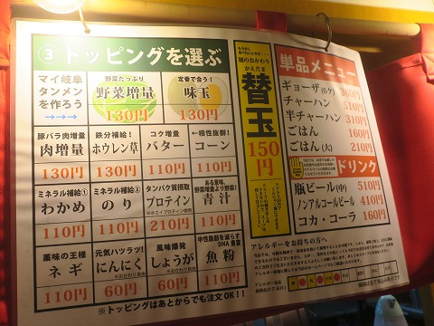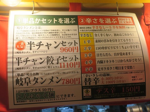 19:08 注文が 店内に入り、カウンター席に座るやいなや、すぐに 『ご注文は』 って、迫られます。 初めてのお店ですから、まずはメニューを見ないとねぇ。 で、まず、単品かセットかを選ぶ訳ね。 基本の麺は”岐阜タンメン”のみ。 しょうゆとか味噌とかは無い訳ね。 あとは、付け合わせにチャーハンとか餃子とか、あとご飯があります。 そして、”辛さ”。 辛さは”2辛”を選びました。 |