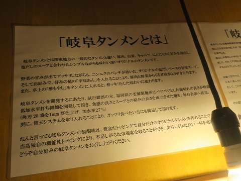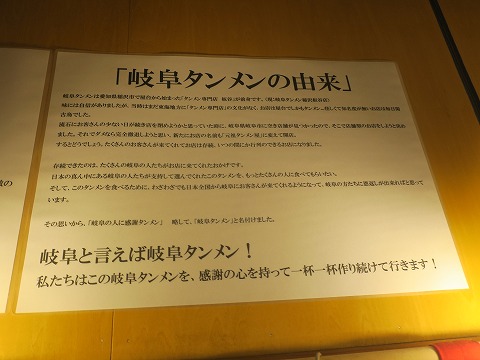 19:09 由来を 岐阜タンメンが出来るまで、壁に貼ってある能書きを読んで時間を潰す。 関東から来た自分は、”岐阜タンメン”って、喜多方ラーメンや尾道ラーメンの様に岐阜のご当地ラーメンかと思ったら、違いました。 このお店の発祥は、元々は愛知県の稲沢市。 最初は屋台のタンメン屋だったそうですが、お店は流行らず。 その後、岐阜市に移って、店舗開店したらヒットしたらしく。 それで、岐阜に対するオマージュで、”岐阜タンメン”と言う名前のお店にしたらしい。 なので、このお店(グループ店)の登録商標みたいなもんなんだね。 |