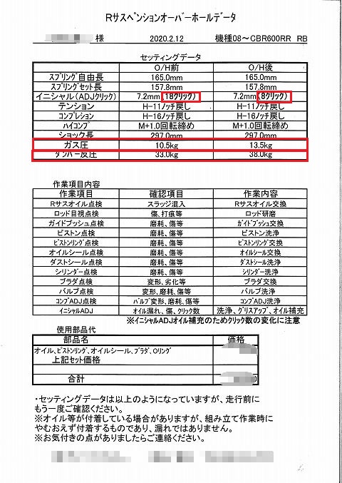 オーバーホールデータ オーバーホールデータも添付。 イニシャル(アジャスト クリック)は油圧で押している(らしい)のですが、オイルが漏れていたとのこと。 規定のオイル量を入れた結果、規定の寸法にするのに、クリック数が 18 → 8になりました。 窒素ガスも使っていると抜けます。 ので、規定値の13.5kgまで補充填。 やっぱり、サスペンションは定期的にオーバーホールしないとダメみたいですね。 |