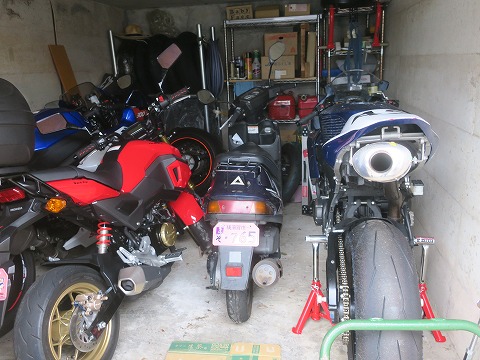 15:11 ガレージで ガレージで馬に載っているCBR600RR。 リヤサスを外してあるので動かせません。 それにしても、狭いガレージにバイクが4台。 キツキツだね。 このままじゃ作業できないので、とりあえずADRESS V100 を雨の中、外に出しちゃいましょう。(笑) GROM新しく買ったからって、ADRESS に対する扱いが非道いよね。 |