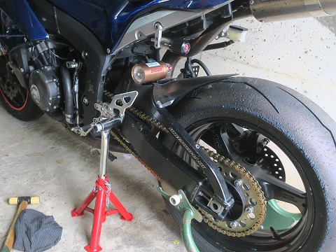 15:45 作業終わり 最後に、リヤのレーシング スタンドかけて、馬を外したら作業終わりです。 リヤサスなんて、上下2本のボルトで止めてあるだけなのに、組み付けに小一時間もかけちゃダメでしょう。(笑) |