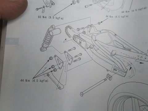 サービスマニュアルを 締付トルクはサービス マニュアルで確認。 サービスマニュアルの挿絵を見ると、ボルトとナットの方向が逆だ。 マニュアルだと、車体の右側からボルトを入れて、左側でナットで留めているけど、この車体は左側からボルトを入れて、右側でナットで留めているんだよね。 左から右にボルトを通した方が整備しやすいのかな。 |