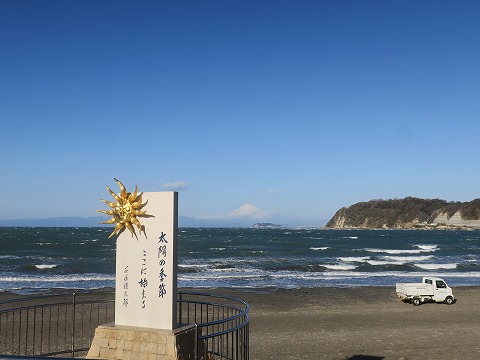 8:32 逗子海岸から 自宅のある横須賀を出発して、逗葉新道を西走し、長柄の交差点から国道134号線に入り西走して、目の前に相模湾が広がる逗子海岸までやってきました。 今日は風が強いです。 南風です。 気圧配置によっては、”春一番”宣言が出るかな。 (実際は2020年関東地方の春一番は約1週間後の2月22日の土曜日でした) 逗子海岸には石原慎太郎の”太陽の季節”の碑。 その右手に富士山。 その下に少しかすんで江ノ島が見えています。 |