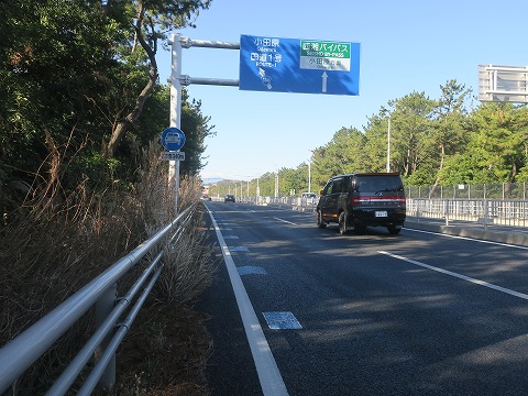 9:27 国道1号線へ さて、江ノ島近くの吉牛で朝ご飯を食べた後、引き続き国道134号線を西走し、大磯町にある終点の西湘バイパスの乗り口までやってきました。 GROMは(自動車専用道なので)直進できませんので、左に逸れて国道1号線の旧道(?)に向かいます。 |