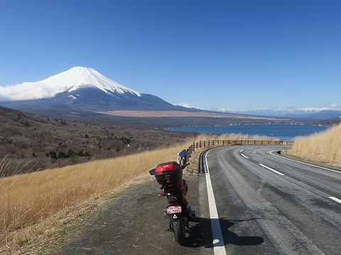 11:30 視界が開ける 三国峠を越えて山梨県側に入ると、視界が開けます。 今日一番の富士山。 山中湖とコンビネーションで写真に固定しておきます。 今日は路面が凍結している箇所はありませんでしたが、路面にははっきりと融雪剤の塩化カルシウムを撒いた跡が・・・、バイクが錆びそう。 GSX-Rでは、走る気になりませんぜ。 滑りそうだし。 今日は2月としては暖かいですが、流石にこのあたりを走っていると、ウィンターグローブでも指先がじんじんと冷たくなってきます。 |