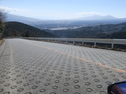 12:47 急勾配を 平野の交差点から山梨県道730号山中湖小山線に入り南東に走り、一旦ちょっと神奈川県をかすり、静岡県側に入り静岡県道147号に変わり引き続きGROMを走らせます。 眼下には、富士スピード ウェイのコースが見えます。 この区間、約5kmで600mも標高を下げる、急勾配。 舗装も急勾配のところでよく見られるコンクリートの”Oリング 舗装”。 こんなところが凍結したら、バイクはひとたまりもないですね。 この急勾配を一気に下るとブレーキにかなり負担があります。 「GROM だとどうかな?」 と思いましたが、この(寒い)時期だと大丈夫でしたね。 |