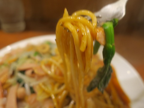 18:11 味は 箸上げならぬ、パスタ上げ。(笑) スパゲティは今まで訪れたあんかけスパゲティの同じ様にやや太めの中太くらいの麺かな。 それでは「いただきます。」 あんかけスパゲティの味の特徴として挙げられるコショウの辛みですが、前回のあんかけ太郎、名古屋駅のあんかけスパゲティとの中間くらい。 大人が食べるスパゲティとしては、イイ感じにコショウが効いています。 あんかけスパゲティは事前に茹で置きしたスパゲティを炒めて、あんや具材と混ぜて作られますが、麺がかなりオイリー。 今まで訪れた3軒の中で一番オイリー。 このお店のあんかけスパゲティが全体的にこの油分の多いのを特徴としているのか、たまたま自分が食べたのが油が多かったのかわかりませんが、横浜家系の豚骨ラーメンぐらい油分が多い様に感じましたね。 自分には、ちょっと油分が多すぎかな。 |