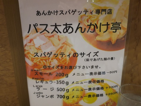 18:07 メニューで重要なのは メニューを見る一番の目的は”量”。 あんかけスパゲティ屋さんは、量が選べるところが多いみたいですが、その量が問題。 下手に大盛なんて頼んだら、かなりイタい目に合いそう。(笑) 1月末に訪れた”あんかけ太郎”の標準が400gとちと多めでしたが、ここパス太あんかけ亭のレギュラーは350g と自分的にちょうど良さそうな量です。 で、ミラカンのレギュラーサイズを注文。 |