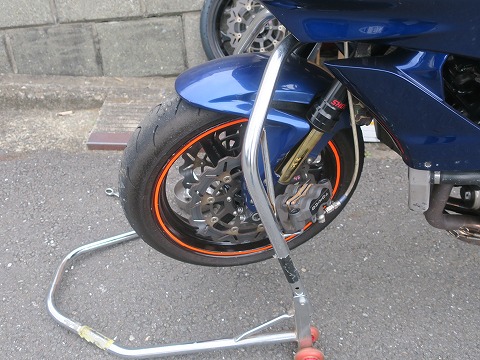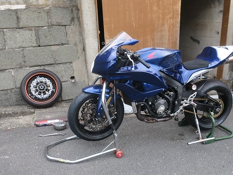 15:46 走行前の整備 一般道は走行できないサーキット走行専用のCBR600RR。 明日は今シーズン初の筑波サーキットの練習走行の予約をしてあるので、走行準備をします。 ガレージからCBRを引っ張り出して、まずはタイヤを交換。 去年の10月にエビスサーキットの走行会以降、サーキットを走ってません。 リヤは PERELLIの現行のタイヤを履いていますが、フロント タイヤは在庫処分でMETZELER の旧型のタイヤを履いたままです。 まずは、フロント タイヤの交換から。 |