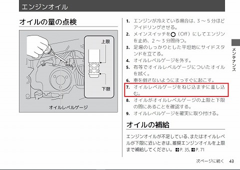 17:15 レベルを確認 オイルを注入したら、軽く暖機してオイルレベルを確認。 レベルゲージをねじ込んでレベルを確認すると OK! じゃなかった。 (ーー;) |