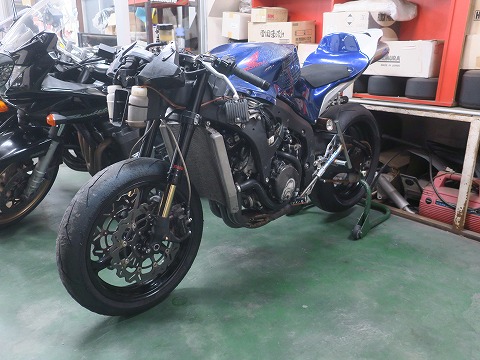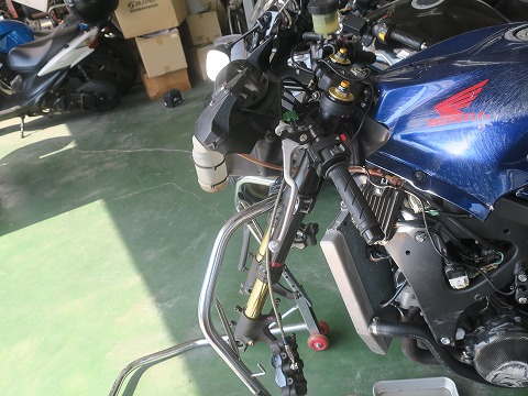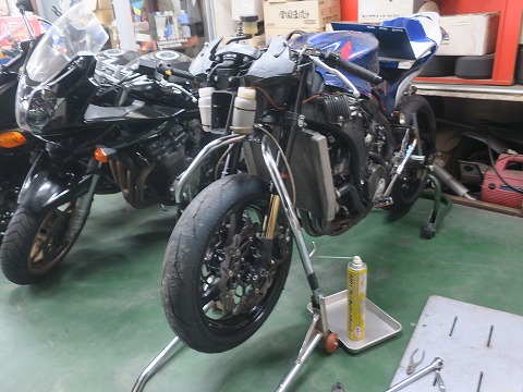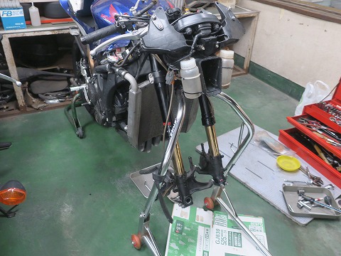 14:18 今回も整備 4月25日(土)の筑波サーキットの練習走行を3月に事前予約をしましたが、自粛で休業になり走れなくなりました。 ので、プラグの交換に引き続き、今回はフロントフォークのオーバーホールをすることにしました。 フロントフォークのオーバーホールは、エアーインパクトレンチ他、専用工具も必要なので、自宅でちょこちょこってする訳にはなかなかいきません。 ので、気軽な整備の参考になりませんね。 まあ、サラサラッと読み飛ばしておくれ。(笑) 今回は記事は整備の備忘録です。 まずは、アンダーカウル、フロントカウル、フェンダーを外しておきます。 次に、リヤ、フロントともにレーシング スタンドを使って、フロント タイヤを浮かせてフロント フォークをフリーにさせます。 |