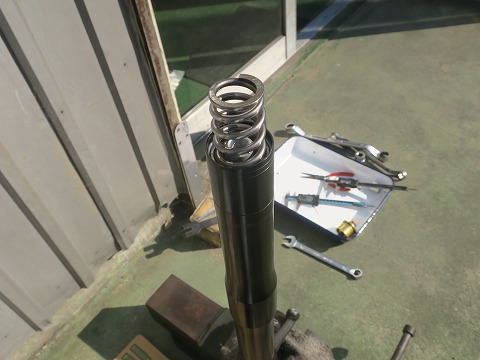 15:27 キャップを外す 街乗りのだと、専用工具のスプリング カラー ホルダを使ってキャップに架かっているスプリングのテンションを押さえて、その間にキャップを緩めるんだけど・・・・。 これは違うよね。 サーキットでフォーク スプリングを外す時、フロント フォークをバイクから外してなかったもんね。 と記憶していますが・・・・・。 (なんせ5年以上前のことなんで・・・・・。) 色々と格闘して、キャップ 外れました。 格闘していたので、写真を忘れた。(笑) 反対側のフォークをバラすときに写真をちゃんと撮っておこう。 (^_^)v |