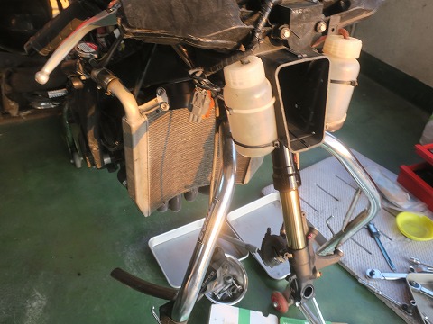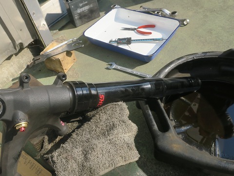17:49 今度は右側 左のフォークのオーバーホールが終わったので、車体に取付け。 今度は右側のフォークを外しました。 |