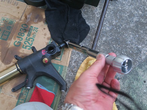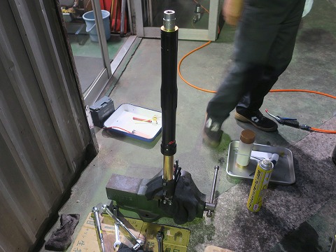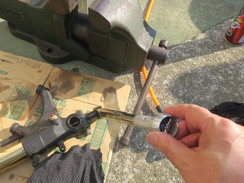 16:01 ダンパーを フォークパイプに付いている部品を外したら、次はフォーク パイプの中に固定されているダンパーを取り外します。 ダンパーは、フォークパイプの下端に六角穴付きボルトで固定されているので、このボルトを緩めて外します。 が、ダンパーを支えるものがないので、手で緩めても供回りしちゃいます。 ので、このボルトを緩めるにはエアーインパクトレンチが必要。 エアーインパクトレンチ、欲しい。(笑) あったら、クルマのタイヤ交換が楽になる。 フォーク パイプからダンパーを外したら、中に溜まっているフォークオイルを全部抜いて、パーツクリーナで掃除、エアーを吹いて残留物を吹き飛ばして乾かします。 ダンパーはAssyでバラせないので、作業をするのはそこまで。 そこまで、出来たら逆の手順で組み立てていきます。 |