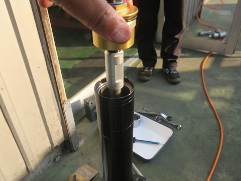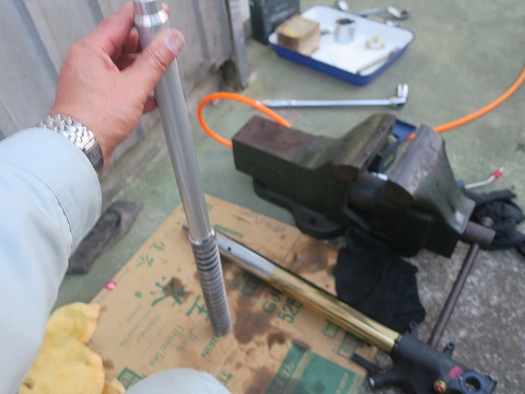 18:18 ダンパー オイルを捨てたら、スライダーパイプからアウタ チューブを抜いて、スライダー パイプの底部にある六角穴付きボルトを緩めて、ダンパーを外します。 上がさっきは写真を撮り忘れたダンパー、下はスライダー パイプ。 ダンパーはこの状態でAssyなので、バラせない、バラさない。 バラしたら組み立てる自信がありません。(笑) |