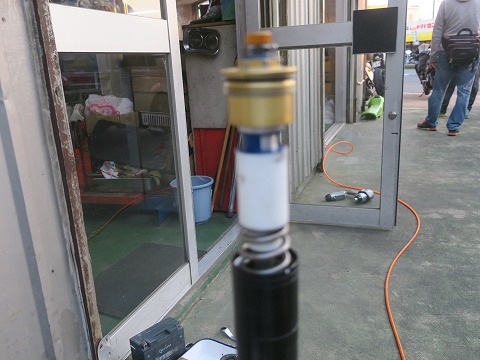 16:30 エアー抜き オイルを入れたら、エアー抜き。 ダンパーに行き渡るように、シリンダを上下動させます。 最初は、空回りして軽く動きますが、エアーが抜けてオイルが回ると、ダンパーの手応えになってきます。 エアー抜きが終わったら、しばらく放置プレイ。 フォークオイル内のエアーが抜けるのを待ちます。 マニュアルをみると5分くらい。って書いてあります。 ノーマルの場合、もう少し固い10番を使っているので、5番を使っているレースベース車の方がエアーは早く抜けるかな。 |