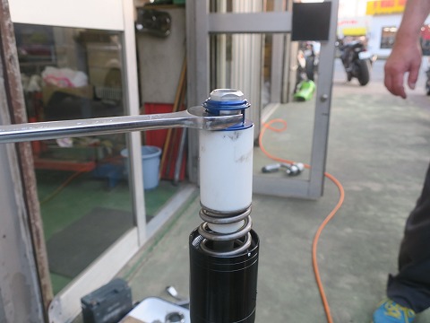 17:54 キャップを外すには キャップを外すには、スプリング カラー(白いの)の上にあるスプリング シート ストッパとダンパーを17mmのオープンエンド スパナで押さえて、キャップの上のナットを緩めると外れます。 この辺がレースベース車。 油面調整やフォーク スプリングを交換するのにスプリング カラー ホルダなどの特殊工具なしにバラせます。 けど、組むときに特殊工具が必要なんですよね。(^_^;) |