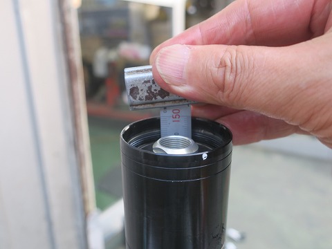 17:57 油面を確認 フォーク スプリングを取ったら、今の油面高さを確認しておきます。 油面高さの確認はオイル レベル ゲージの要領で。 150mmのスケールを挿入して、何mmまでオイルが付着しているかで。 レースベース車のスタンダードが120mmですが、このフォークはそれよりちょっと少ない程度かな。 フォークスプリングに付着しちゃった分もあるので、正解はわかりませんが、あくまでも目安で。 |