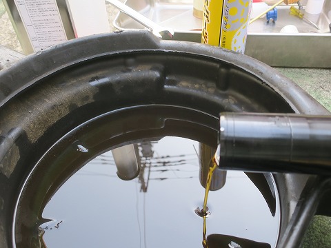 17:59 オイルを捨てる 油面を確認したら、オイルを捨てます。 最初に作業した左側のフォークの時は写真を撮るタイミングを逃しちゃったので、慎重に。(笑) エンジンオイルじゃないこともあるので、そんなに汚れていませんね。 きれいです。 このフォークに入っていたオイルは、普通の茶褐色のオイルでした。 |