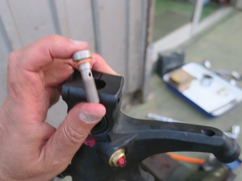 18:23 ワッシャは新品に スライダーの底部でダンパーを組み付ける六角穴付きボルト。 ダンパーのオイル流路の穴が開いてます。 頭の近くにある銅色しているのは、銅製のワッシャー。 これも新品に交換。 100円ちょっとのお金をケチって、後からオイルが漏れたんじゃ、目も当てられませんからね。 |