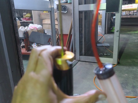 19:02 油面を調整 オイル レベルはレースベース車の規定値で。 右の注射器で、多めに入れたフォークオイルを吸い取って調整。 |