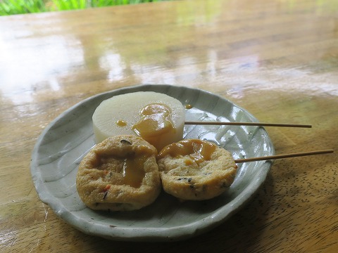 11:30 おでんは 一旦店内に入り、外に出て軒先にあるテラス席(?)に座ります。 お品書きをみて注文。 注文を済ませたら、うどんが供されるまでの間の場つなぎ、セルフのおでんを取ってきました。 おでんは一串 140円。 大根とがんもどき。 味噌だれを付けて、いただきます。 寒い季節のツーリングだと、ホント胃に染みます。 |