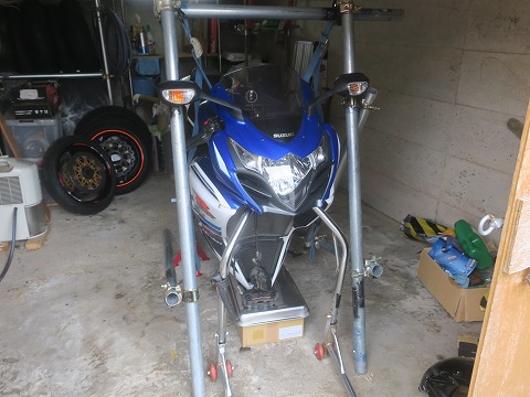 14:28 単管をバラす 吊しっぱなしのGSX-R。 この状態で約1ヶ月、落ちずにすみました。(笑) まずはフロント スタンドで持ち上げて、単管をバラします。 狭いガレージで作業をするのにCBRとか邪魔なので、一旦外に出しておいて。 |