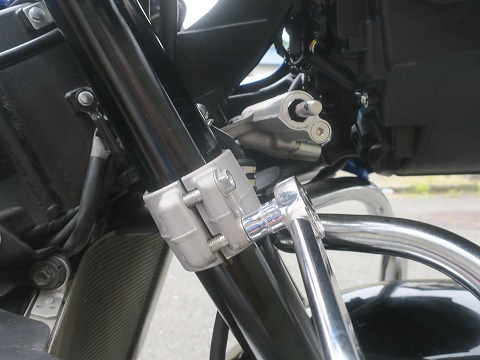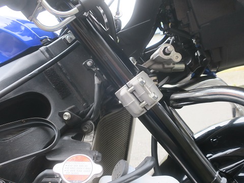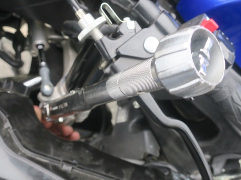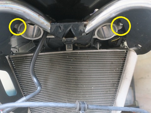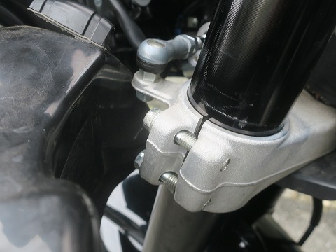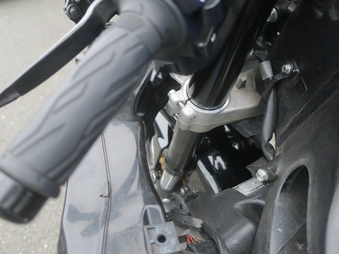 17:04 エアーダクトを外す 左側はケーブルがあったりして、ずらすこことは出来ましたが完全に取り外すことは出来ませんでした。 けど、右側は写真の通り、ボルト1本外せば完全にエアーダクトを取り外せます。 作業しやすい。 まずは、ボルトを緩めてフロントフォークの方向を直してから、再締結。 |