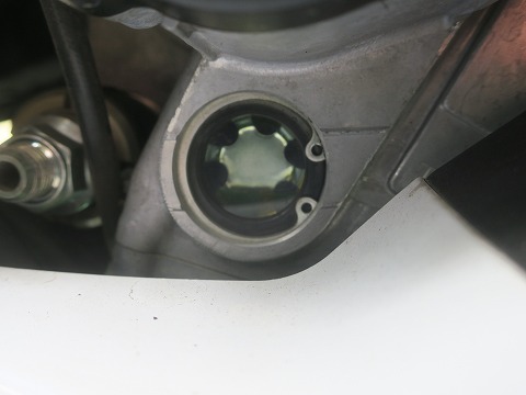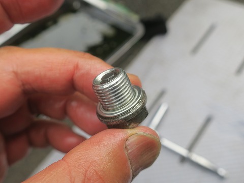15:06 ドレンボルト ドレンボルト。 毎度のワッシャー、ガッツリ食い込んでる系。 ワッシャーを外す時に、ネジの部分にキズを付けちゃって・・・。 |