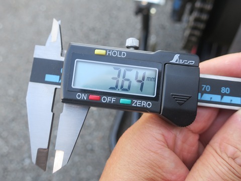 15:39 残溝を計る デジタルノギスで簡易的に残溝の深さを測ってみます。 ノギスのお尻だと、面積が小さいので、めり込み気味。 なので、少なめになるかな? |