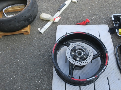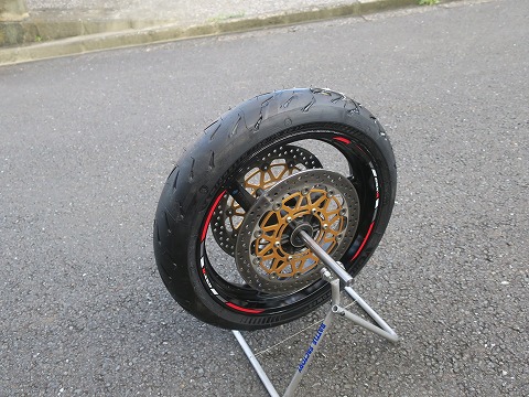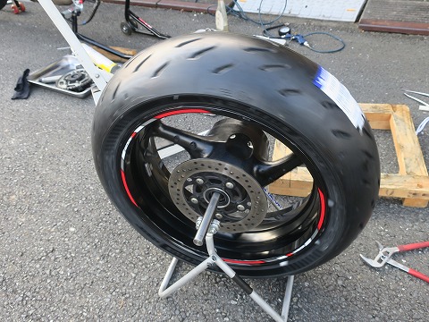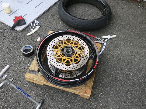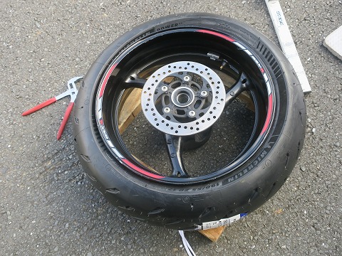 17:15 組んだ 組み付けました。 写真の時間を見ると、タイヤを交換している時間自体は短いでしょ。 交換作業の半分以上は掃除してますね。 組み付けたら、エアーを入れてビートを上げます。 |