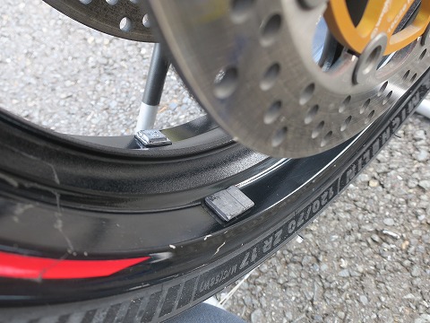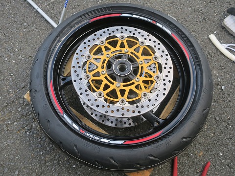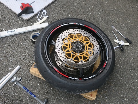 17:02 フロントタイヤには フロントタイヤ側は、左右に大きなブレーキディスクが装着されているので、ディスク板に力が加わらないよう、気を付けて作業。 ディスク板に横から無理な力が加わると、曲がったりするからね。 |