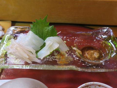 19:08 三沢の昼イカ カウンターの別のお客さんが、イカ刺しを頼んだので、便乗。 地元の三沢漁港で水揚げされるイカで、ブランド名は”赤とんぼ”。 昨晩穫れて、今朝三沢漁港に水揚げされたもの。 肝醤油を付けて食べると、旨い。 旨いねぇ~。 (^_^)v |