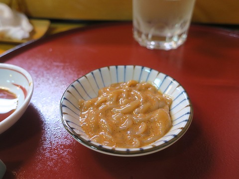 19:03 ホヤ酢 この時期、東北を訪れたなら外せないのがホヤ。 ホヤ酢でお願いしました。 「旨いねぇ。」 鮮度が落ちると出る変な臭みや苦みなどは皆無。 クセになります。 |