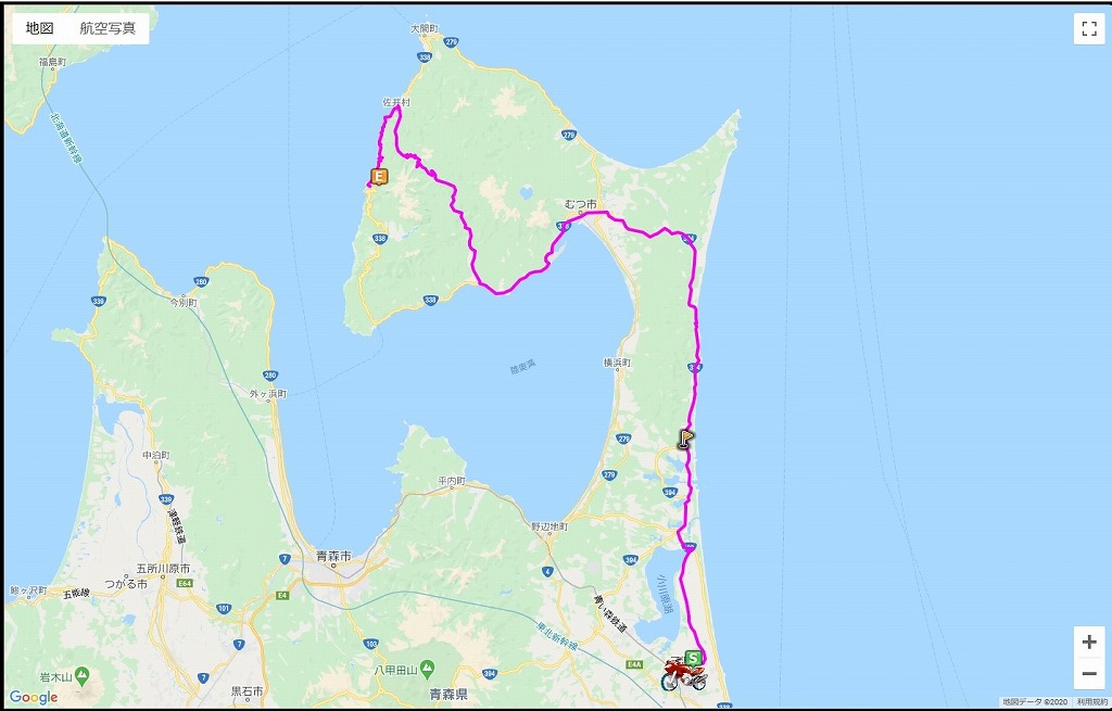 | 8月5日(水)午前の道程: 三沢〜むつ市〜佐井村 :173.67km | |