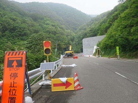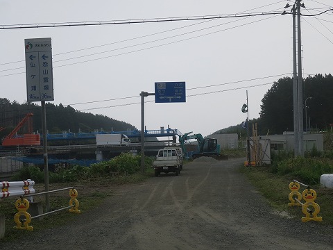 9:15 国道338号線 県道170号線を起点まで北上し、国道338号線との交差点までやってきました。 交差点は工事中。 この交差点を左折して、国道338号線に入り、むつ市方面を目指します。 |