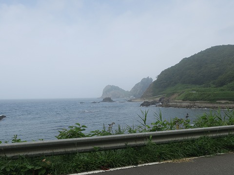 11:53 願掛岩(がんかけいわ) 佐井漁港からは、国道338号線に入り、少し逆戻りする形で大字長後(ちょうご)の福浦漁港を目指します。 途中にある海に突き出た形の高さが100mほどある”願掛岩”。 ちょっと写真に撮っておこう。 と、思ったときは、時すでに遅し。 ちょっと遠くて、モヤっていて、写真写りが今ひとつ。 真横を通過するときは、ほぼ直立に立ち上がっている岩塊は結構迫力があるんですけどね。(構図の選択悪し) |
