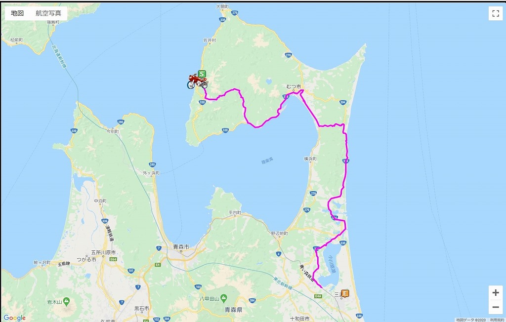 | 8月5日(水)後半の道程: 佐井村 〜 むつ市 〜三沢 :172.35km | |