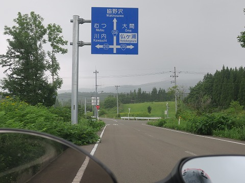 13:10 国道338号線でむつへ 同じルートを逆方向に走るだけなので、途中省略。 県道46号線を南下し川内の市街地で、ふたたび国道338号線に突き当たりました。 ここは左折して、国道338号線に入り東進して、むつ市の市街地を目指します。 |