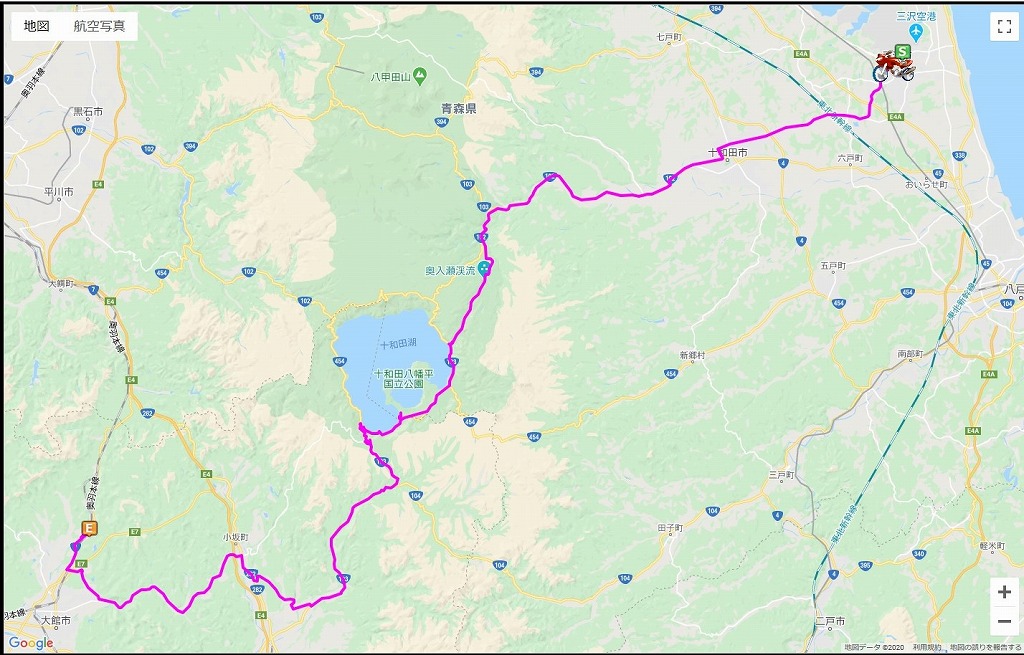 | 8月6日(木)午前の道程: 三沢 〜 奥入瀬渓流 〜 十和田湖 〜 大館市 :129.36 km | |