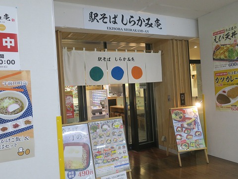 7:50 駅そばで ざっと駅のコンコースを歩いてみたけど、他に開いているめぼしいお店がありませんでした。 ので、ひねりのない”駅そば”で。 一応お店の名前は、”しらかみ庵”。 |