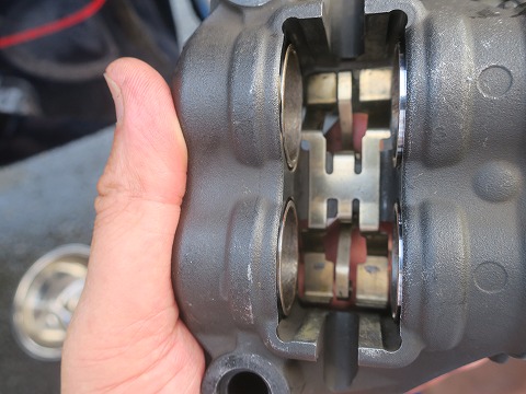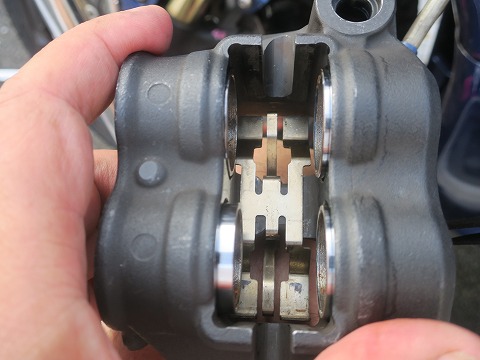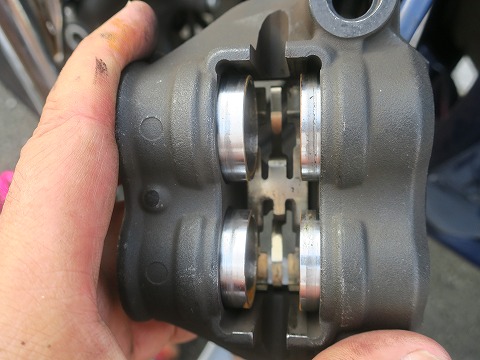 17:22 サビが パッドを外して、パッドの残厚を確認。 する前に、ピストンの先っちょ、サビが出てるね。 パッドと接触している部分だから、メッキ加工とかしても剥がれちゃうので地金なんだね。 CBRの場合、サーキットしか走らないから走行頻度が少なくて、サビが出ちゃうのかも。 これくらいなら、走り始めればすぐに取れそうだし、問題なさそうなので、そのまま使います。 このサビがピストンの壁面まで上がってくる様だったら、ピストン交換しよう。 |