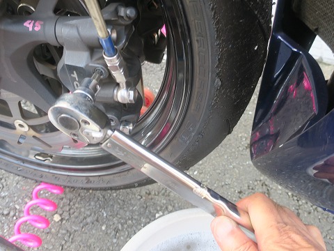 16:27 左側から それでは、左側から。 ブレーキ キャリパーを取り外します。 ピンク色のペイントマーカで書いてある数字は、キャリパーの締付トルク。 サーキット用なので、間違えないように直接書いちゃう。 サーキットにいって、ボルト締めるのに、いちいちサービスマニュアルでトルクを調べてたらカッコ悪いでしょ。 見栄を張っているわけです。(笑) ※ サーキットだからって、サービスマニュアルを見て作業することは、カッコ悪いことではありません。 正しく、整備しましょう。 整備不良で、トラブルを起こすことの方が、カッコ悪いです。 |