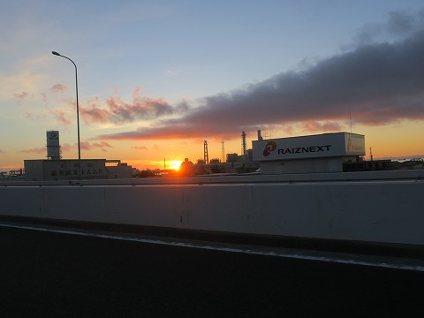 5:17 朝焼け 横横から首都高速湾岸線に入り、根岸の工場地帯を右手に見ながら北上を続けます。 朝日が昇って、東の空がオレンジ色に焼けています。 |