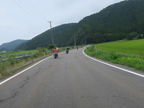 10:43 走り出す 道ばたで休憩、何もないところで30分くらい休憩(?)してましたよ。 休憩の後、来た道を取って帰り、国道118号線を東進、その後国道294号線を経由して、福島県道9号猪苗代湖南線(いなわしろ こなんせん)に入り北上を続けます。 久しぶりに走行中の写真。 交通量も少ないし、アップダウンもカーブも少ないので、手首の負担は少なめです。 でも、今日は無理をせずに、最後尾で大人しくね。(笑) |