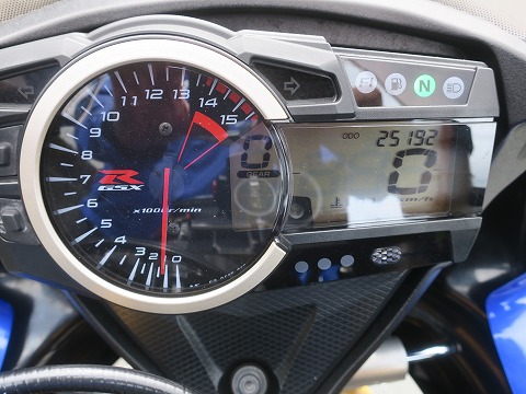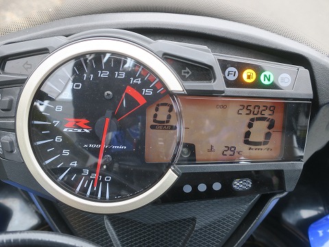 8:22 走行距離 ここまで、GSX-Rで走った距離は 25,029 km。 燃料ランプが点滅してますね。 まずは、ガソリン入れないとね。 とりあえず目的地は、いつもの山中湖。 最近ご無沙汰の忍野の柳原うどんまで行って昼を食べて帰ってこようと考えてます。 オーリンズに換装後、まず一発目に跨がってみて、1Gでの沈み込みで、フロントがちょっと高いかな。って感じ。 このファースト インプレッションって言うのは大事。 人間ってしばらくすると、慣れちゃいますからね。 それでは、出発しましょうか。 |